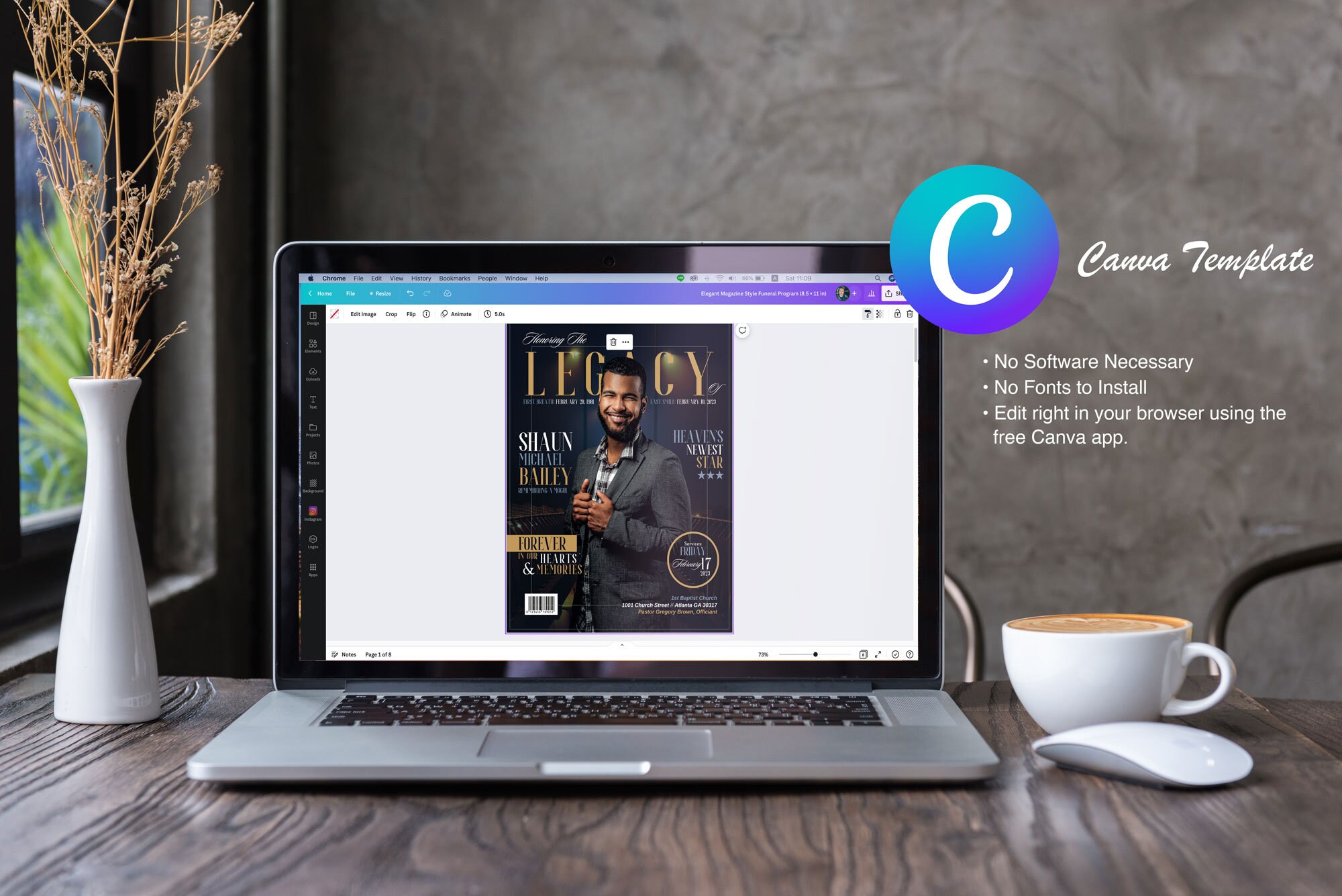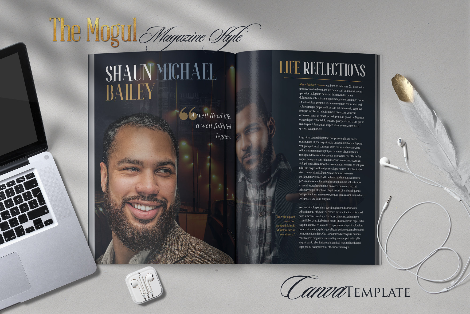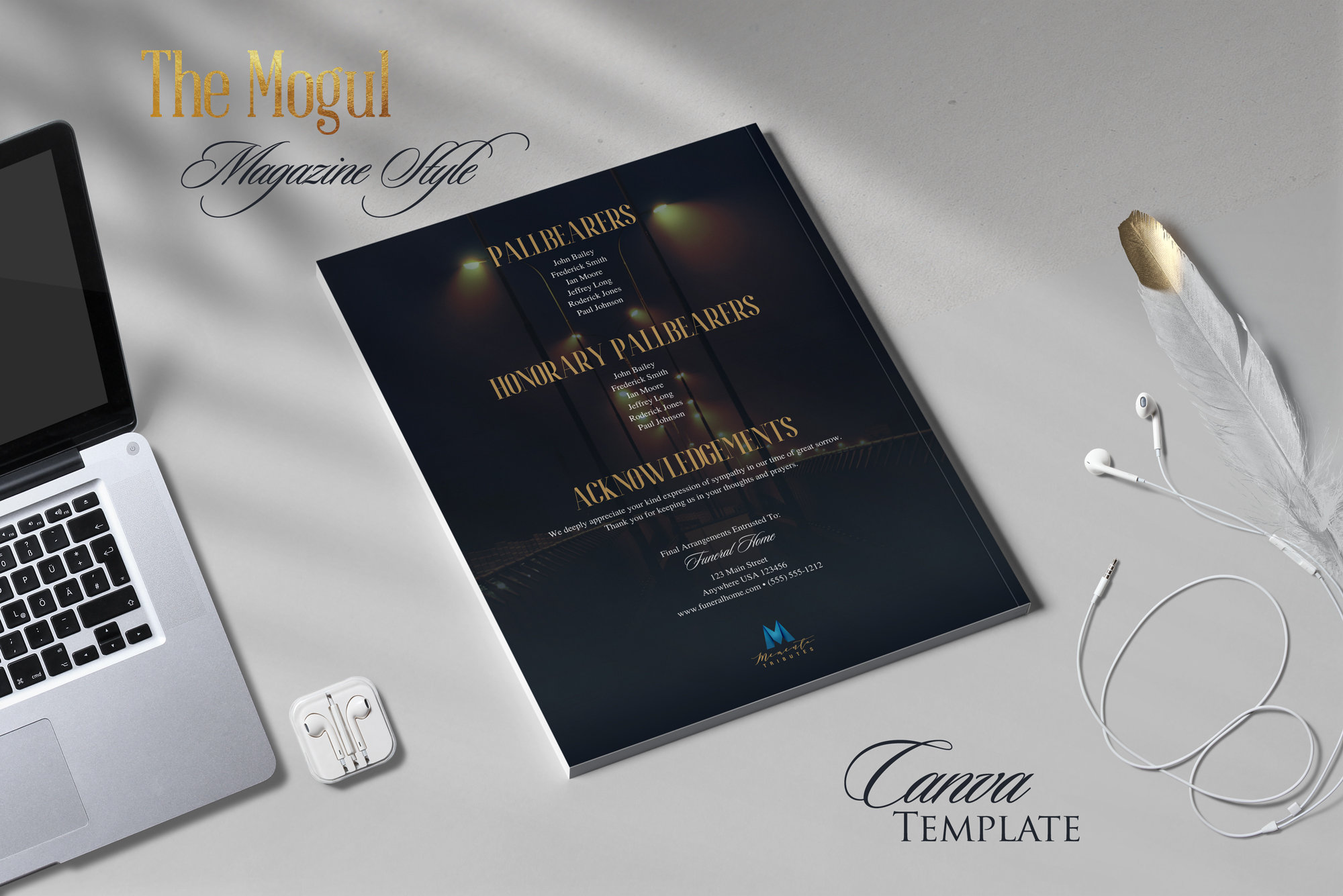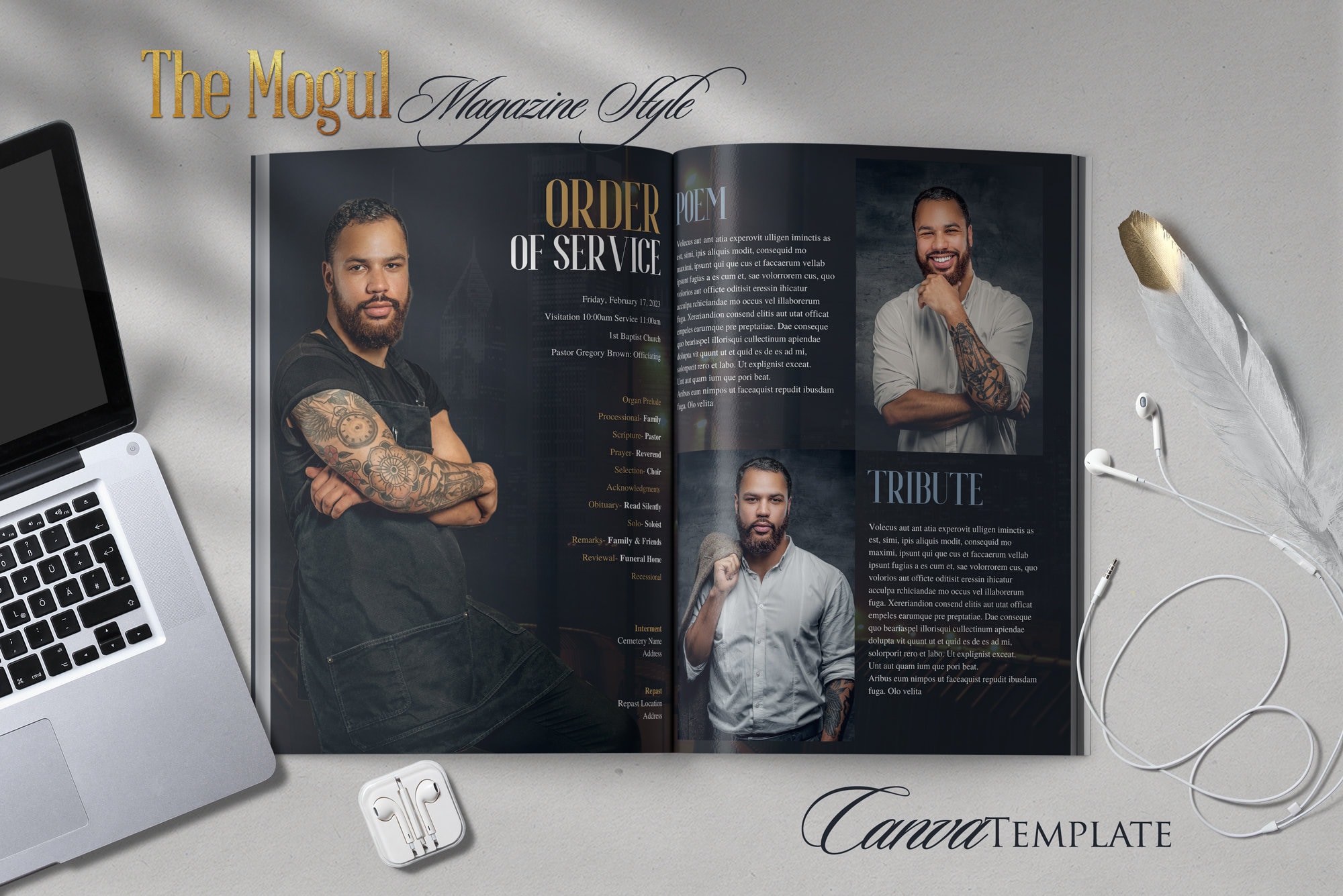 A photo-rich, editorial booklet that honors your loved one the way they deserve to be remembered. The Mogul is an 8-page magazine-style funeral program template designed for families who want something more than a standard folded sheet. Bold spreads, generous photo placement, and a modern layout come together to create a keepsake that feels as significant as the life it celebrates.